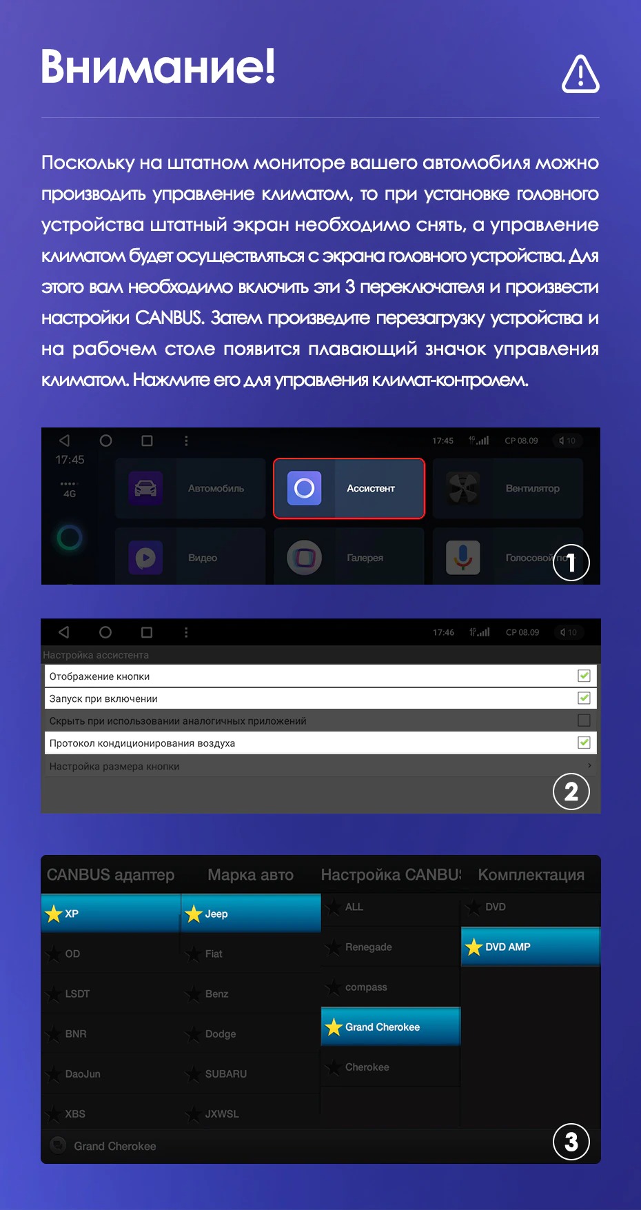 Установочный комплект для Jeep Grand Cherokee WK2 (2013-2020) включает переходную рамку и проводку.