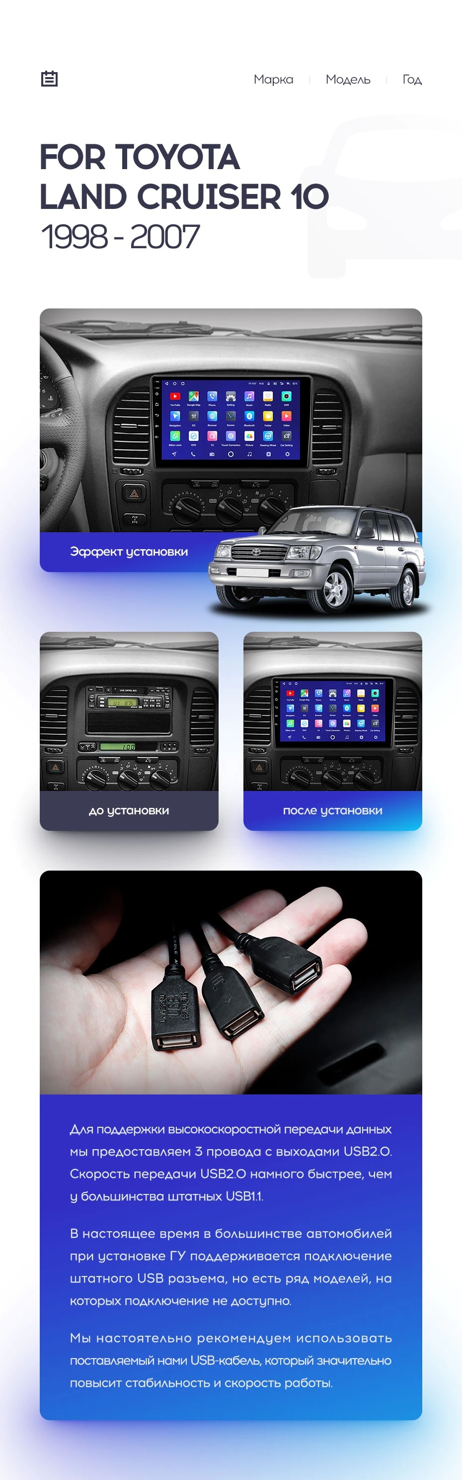 Полный комплект установки магнитолы Teyes с рамкой и проводкой можно выбрать в каталоге штатных магнитол Toyota Land Cruiser 10 J100 100 (1998-2007).